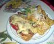 Se dezoseaza pieptul de pui apoi fiecare parte se mai imaprte in doua asa obtinem 4 portii. Se aseaza intr-o tava fileul de pui se condimenteaza. Ciupecile se taie felii , kapia pai, Se aseaza peste pui ardeiul, apoi ciupercile jumate din cantitate, baconul iarasi ciuperci se acopera tava cu o folie de aluminiu si se da la cuptor 30 min. Dupa 30 min se ia folia se pun feliile de cascaval, parmezan ras si se mai lasa 5 min.