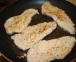 Feliile de piept de pui se spala apoi se sterg bine de apa si se condimenteaza cu sare si piper. Eu am folosit un piept de pui, pe care l-am taiat in 4.