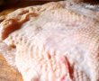 Strangem hartia de copt in jurul pieptului umplut ca o bomboana. Apoi dam la cuptor la foc mic si lasam pana se rumeneste bine deasupra si se serveste cu salata verde facuta simplu cu otet de mere sau zeama de lamaie si pentru copii eu am facut si un pilaf cu orez si legume.