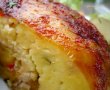 Din cartofi fierti in apa cu putina sare se face un piure in care adaugam mustarul, oul, si cascavalul, ardeiul si cepa rosie, tocate cubulete mici.Ultima data si apatrunjelul verde.Se pune peste fileul de carne o parte din piure , apoi se aseaza pielea deasupra si intorci in sus lasand pielea dedesubt si deasupra carnii pui si restul de piure.Se strang marginile si usor cu ajutorul unei palete se aseaza tot ansamblul pe o tava pe care am pus hartie de copt.Apoi dam cu miere, boia si sos de rosii pielea de pui.