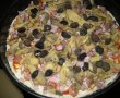 Deasupra blatului punem sucul de rosii ,ciupercile,cabanosul,sunca,maslinele,pieptul de porc repatizandu-le uniform pe intreaga suprafata.
