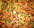 Intr-un bol amestecam bulionul cu sare (delicat), piper, zahar si laptele. Scoatem tava si ungem aluatul cu sosul facut,radem branza deasupra uniform, adaugam sunca afumata taiata bucatele, salamul, baconul, muschiul taiat fasiute, maslinele rondele si dam la cuptor pt 20 minute. Scoatem apoi din nou si adaugam oul batut cu patrunjelul si mai putem rade inca putin cascaval daca dorim si mai lasam inca 5 minute la cuptor si gata