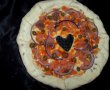 4.Pe restul suprafetei vom presara toppingul format din:ketchup,somon afumat,ceapa rosie,capere,cascaval afumat,rosii cherry.
