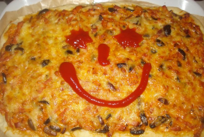 Dupa ce a crescut aluatul il intindem in tava,punem umplutura si intindem sa acopere toata suprafarta,radem cascaval si dam tava la cuptor.Se serveste cu kechup....pam-pam...
