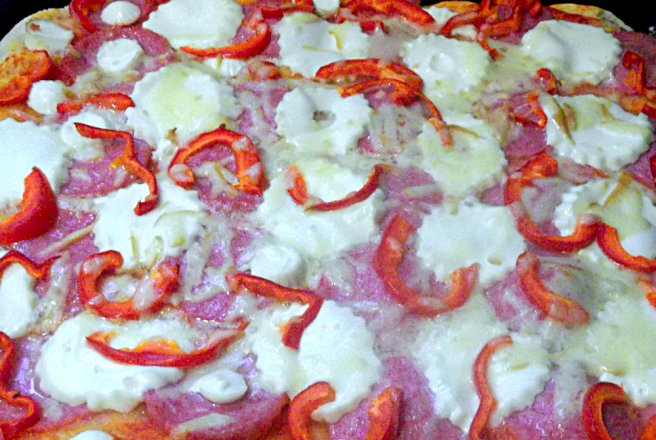 Ungem si aluatul cu ulei, apoi cu sos de pizza, dupa care vom pune cascaval ras, salamul, ardeiul rosu si deasupra felii de miez de lapte.