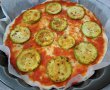 Topping-ul: Dovlecelul il taiati rondele potrivit de groase. Intr-un bol amestecati sare, piper, boia dulce, praful de usturoi, cimbrisorul si uleiul. Peste acest amestec puneti dovleceii, amestecati bine, ii lasati 10-15 bine sa ia din toate aromele. Incingeti o tigaie antiaderenta, o ungeti cu ulei, rumeniti usor feliile de dovlecel, pe ambele parti. Le scoateti pe o farfurie. Sunca o taiati cuburi potrivite, iar mozzarella o dati pe razatoarea mare. Dupa ce aluatul a dospit, il rasturanti pe masa presarata cu putina faina, il impartiti in doua. Luati prima bucata, intindeti o foaie potrivit de subtire. La fel procedati cu cealalta bucata de aluat.