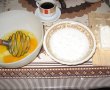Intre timp se bat ouale intregi, se pune un plic praf de copt, branza sfaramata cu furculita sau data pe razatoare, se pune faina si se dilueaza cu laptele rece. Trebuie sa iasa un aluat de consistenta celui de clatite, dar putin mai gros. Se amesteca ingredientele din carne in aluat, se mai pune o legatura de marar tocat marunt, se aseaza in tava unsa si tapetata cu faina si se da la cuptor 35-40'. Cand este gata se scote din cuptor, se pune cascavalul ras deasupra si se baga din nuo la cuptor, dar cu focul stins pentru ca e suficient de cald incat sa se topeasca si chiar sa faca o crusta cascavalul.Se poate servi cu muraturi sau chiar si cu ketchup ca la pizza.