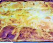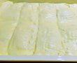 Ultima foaie se unge cu compozitia ramasa( in jur de o cana in care am pus si untul si am amestecat bine pana la omogenizare). Eu am intepat foaia de deasupra pe toata suprafata si am si portionat-o usor cu un cutit ascutit.