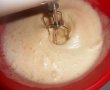 Intr-un castron am batut spuma 9 albusuri,am adaugat peste ele unul cate unul 8 galbenusuri( al 9-lea galbenus l-am pastrat pentru a unge foile deasupra),am adaugat coaja de limeta,zaharul brun,am mixat bine apoi am adaugat iaurtul.Am amestecat bine.