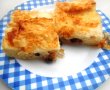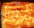 Peste primul strat de foi am pus compozitia de iaurt,apoi restul de foi,tot asa ungand cu unt tot a 3-a foaie pana am terminat cu toate foile.Deasupra am uns foaia cu galbenus,am presarat zahar brun si am dat tava la copt pana cand foile s-au rumenit frumos si umplutura de iaurt s-a intarit.