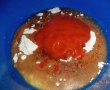 Pregatim mai intai aluatul, pe care trebuie sa-l lasam la crescut pana isi dubleaza volumul. Punem intr-un castron faina,drojdia, boiaua, sarea si zaharul.Adaugam apa, uleiul si sosul de rosii si framantam pana obtinem un aluat omogen si elastic, pe care il punem intr-un loc caldut, ferit de curent.