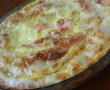 Răsucim și facem un rulou pe care-l așezăm în tavă pe margine. Continuăm până la terminarea foilor și a brânzei. Rulourile se pun unul în continurea celuilalt, câte 4,5 rulouri la tavă. Ungem rulourile din tavă cu restul de ulei și turnăm peste ele o compoziție ce o preparăm din restul de smântână (250 g) și 3 ouă bătute bine. Se dă la cuptor la 180 grade C pentru 30 minute și 200 grade C pentru alte 10 minute, mărind temperatura se rumenește foarte frumos deasupra.