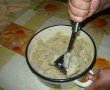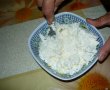 Piureul de conopida se amesteca cu branza de oi sfaramata, ouale batute, smantana, nucsoara rasa, sare si piper dupa gust.
