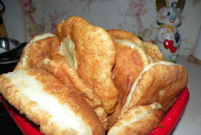 Masa de lucru o infainam, rupem bucati din aluat pe care le umplem cu branza si cascaval. Unim capetele, formam o bila pe care o intindem cu sucitorul. Le prajim in ulei si le scoatem pe prosoape de hartie.