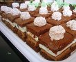 Pentru glazura de ciocolata, procedam la fel ca si la ganache, topim ciocolata pe baie de aburi impreuna cu frisca si punem cate o lingura de ciocolata pe fiecare patratica de prajitura. Apoi ornam cu frisca. Eu am batut 100 ml frisca lichida si am adaugat o lingurita din ciocolata de la glazura.