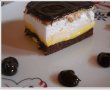 Dupa ce crema si blatul s-au racit se asambleaza:Blatul se pune intr-o tava curata,se insiropeaza,se distribuie crema de ou,apoi frisca batuta si se acopera cu biscuiti inmuiati in lapte/sirop,lasandu-se spatiu inte ei pentru a putea taia.Se lasa la rece cel putin 3 h.Se orneaza cu ciocolata.