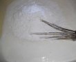 Se pun galbenusurile peste albusuri si se amesteca cu telul apoi se adauga faina cu praful de copt si se omogenizeaza bine. De obicei se spune ca nu se mai mixeaza cu mixerul, ci se amesteca usor cu telul,dar mie nu imi place cum iese faina amestecata usor.Eu mai mixez cu mixerul ca sa iasa compozitia omogena si fara cocoloase de faina.