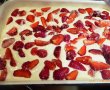 Punem o hartie de copt pe fundul unei tavi mari si turnam compozitia,apoi punem deasupra capsunile pe care le-am presarat in prealabil cu gris.Dam la cuptorul preincalzit,la foc potrivit,cam 30minute.Facem testul cu scobitoarea.Oprim focul si lasam in cuptor inca vreo 10minute inainte de a scoate blatul.Lasam sa se raceasca,dam hartia jos de pe fundul blatului.