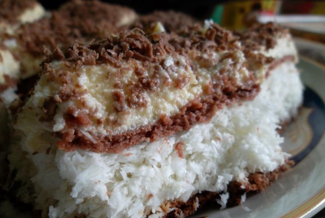 Asezare in tava: Intr-o tava tapetata cu hartie de copt se pune una din cele 2 foi apoi crema de cocos apoi punem si a 2a foaie.A 2-a foaie o intepam usor cu furculita.Se coace la cuptor la foc potrivit pentru 40 de min ( depinde si de cuptor) .