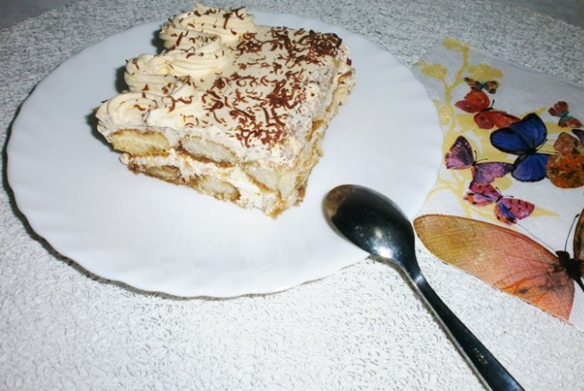 Piscoturile se inmoaie in cafeaua strecurata si se aseaza pe tava/platou. Se pune crema, se mai adauga un rand de piscoturi, apoi se pune iar crema.
