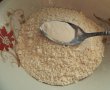 Turnam galbenusurile peste albusuri si amestecam. Adaugam faina in care am pus praful de copt si amestecam incet de sus in jos, doar atat cat sa se incorporeze faina.