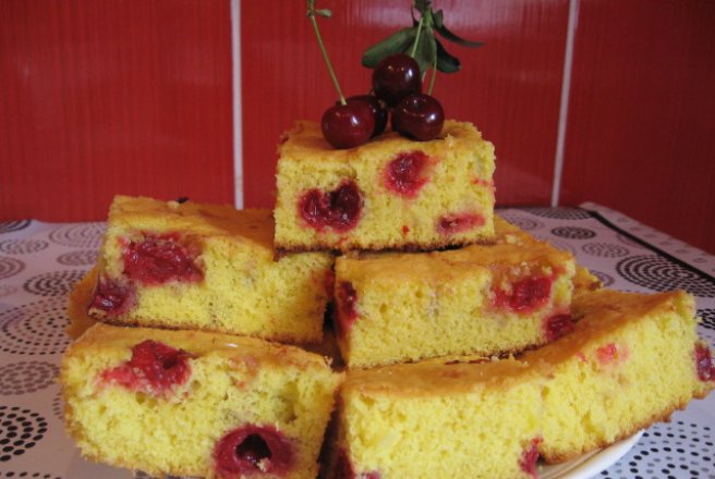-visinele (fara samburi) le-am adaudat in doua etape,prima transa cand am dat prajitura la cuptor,si transa a doua dupa aprox 15 min