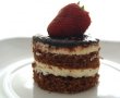 Combinatia dintre blatul foarte fin si usor, crema de vanilie untoasa, bezeaua pufoasa, glazura amaruie… este dementiala! Aceasta prajitura delicioasa poate fi portionata in forma de romburi mici, ideale pentru ocazii speciale cu multi invitati in care nu se pot servi deserturile cu lingurita.