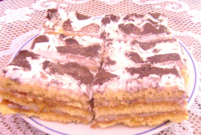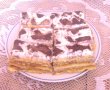 Începem să asanblăm prăjitura astfel: punem prima dată un blat cu caramel, peste el cremă, apoi celălalt blat cu caramel şi iar cremă, deasupra vom aranja ultimul blat, peste care vom pune puţină cremă, dacă ne mai rămâne şi frişca bătută.