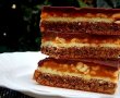 Pregatim si glazura neagra la fel ca si glazura alba si turnam peste caramel. Lasam cateva ore la rece si taiem cu un cutit trecut prin apa fierbinte.