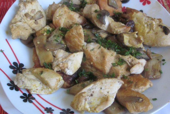 Pieptul de pui se taie bucatele, se pune la prajit, fara ulei, in tigaia Doubleta. Dupa ce s/au rumenit un pic se adauga ciupercile curatate si feliate. Se lasa la prajit cca. 10 minute. Se presara sare aromatizata cu praf de curry si se mai lasa la prajit cca. 3 minute. Se serveste cu piure de cartofi si salata de sezon. Pofta buna!