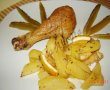 Taiem usturoiul feliute si lamaia o taiem felii mai groase. Punem apoi usturoiul si lamaie peste carne si cartofi. Adaugam apa si acoperim.