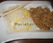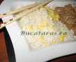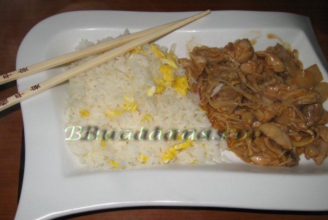 Orezul se fierbe in apa cu sare, apoi se scurge de apa. Oul se bate bine si se face o omleta, apoi se rupe cu spatula in tigaie in bucati mici. Se amesteca orezul cu oul si se serveste cu puiul cu legume.