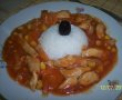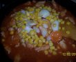 Intre timp se pune intr-o tigaie 2-3 lg ulei la incins si carnea taiata fasiute la prajit. Se condimenteaza cu sare si piper. Dupa ce a inceput sa prinda culoare turnam sosul obtinut peste carne. Lasam sa dea cateva clocote, iar spre final se adauga ananasul taiat bucatele mici, boabele de porumb si cealalta ceapa taiata juliene. Se mai lasa doua trei minute si dam deoparte.