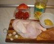 Pregatim puiul pentru impanare, adica-l spalam, il crestam si in crestaturi bagam felii de sunca si catei de usturoi.