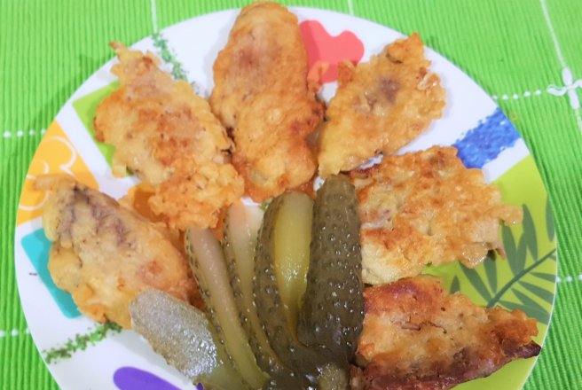 Pentru ca ne-a placut dovlecelul in aluat de bere , am dorit sa testez cum merge si puiul prajit in  astfel.Am folosit carnea fiarta in supa clara de legume .