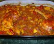 Se pun pulpele la loc deasupra si se mai tine la cuptor 20-30 minute pana scade sosul si se rumenesc pulpele.