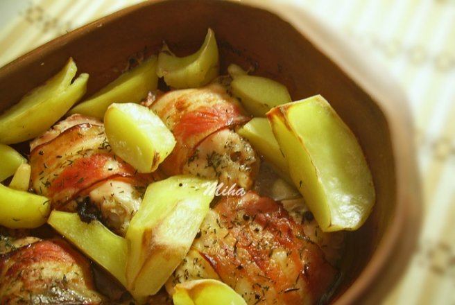 Pulpele spalate si curatate se iate in doua. Fiecare bucata se inveleste strans in cate-o felie de bacon si se aseaza in vasul roman, vas ce l-am tinut in apa rece, cca 30 de minute.