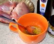 Intr-un bol frecam uleiul cu mustarul pana se ingroasa si devine ca o maioneza. Adaugam oregano si amestecam. Ungem bucatile de carne cu acest amestec.