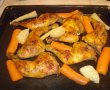 Am curatat bine pulpele si le-am spalat, le-am pus intr-o oala impreuna cu zarzavatul curatat si spalat. Am lasat sa dea citeva clocote, apoi am scos pulpele si le-am asezat intr-o tava, am potrivit de sare, piper si vegeta, apoi am presarat pe fiecare pulpa putina boia si ulei. Am introdus tava in cuptorul incins la 180 grade, lasindu-le pentru 15 minute, apoi am scos si zarzavatul din supa l-am asezat linga pulpe, am lasat pentru 5 minute sa se gratineze.