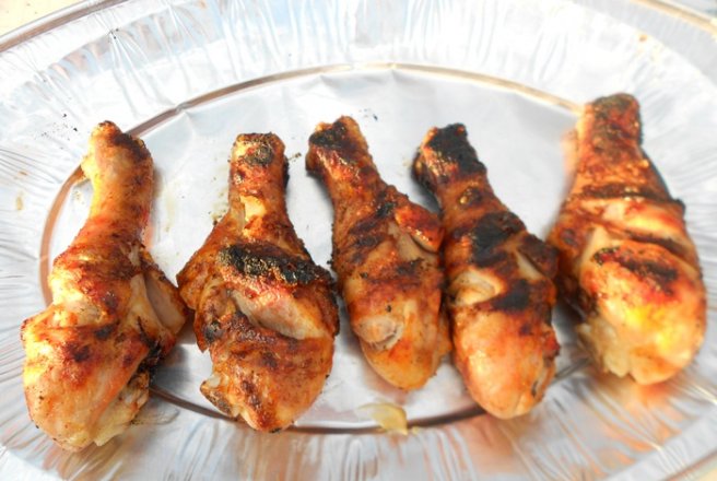 Se clatesc pulpele de pui, se cresteaza pe fiecare parte, se condimenteaza cu barbeque pentru pui. Se adauga cate o feliuta de usturoi unde am crestat, stropim cu ulei de masline si stoarcem jumatate de lamaie. Se lasa 30 minute la rece si se pun pe gratar cca 20 minute.