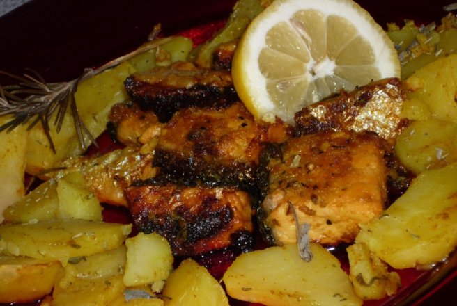 Servim somonul cu garnitura de cartofi alaturi.