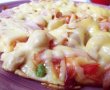 Deasupra pe acest blat puteţi să folosiţi orice ingrediente vă sunt pe plac. Eu am folosit şunca, ciuperci, cubuleţe de bacon puţin prajite, amestec de legume congelate, pe care le-am fiert puţin. Deasupra am razuit cascaval.