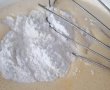 Adaugam zaharul vanilat, laptele, untul topit si faina amestecata cu praful de copt. Amestecam cu telul pana se omogenizeaza.