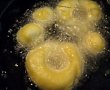 Impartim aluatul in cca 5 bucati mai mari si 5 mai mici; bucatilor mici le dam o forma de bila, pe cele mari le rotunjim, le turtim, si cu degetul facem la mijloc o gaura, care se largeste usor (sa se patrunda bine papanasii la prajit).