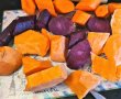 Dupa 40 minute am aruncat un pic din grasimea lasata si am pus in jurul ratei cartoful dulce curatat si taiat bucati, cateii de usturoi, morcovii taiati bucati si ardeii taiati lamele.