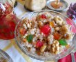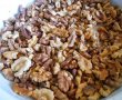 În timp ce grâul fierbe se rumenesc nucile în cuptor și se taie mărunt. Se lasă câteva jumătăți de miez de nucă, pentru decor.