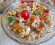 Când grâul s-a mai răcorit, se adaugă nucile rumenite și mărunțite, stafidele și coaja de lămâie și de portocale. La urmă se adaugă esența de rom și se omogenizează.