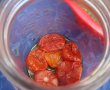 - Intr-un borcan curat punem in strturi sos de busuioc cu usturoi, strat de rosii uscate, iar sos, iar rosii si tot asa pana umplem borcanul.