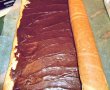 Punem compozitia rezultata intr-o tava tapetata cu hartie de copt si dam la cuptorul preincalzit pana se rumeneste usor pe margini. O dezlipim de pe foaia de copt, o acoperim cu alta foaie de copt si incepem sa rulam cu tot cu hartie. Lasam pana se raceste.