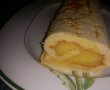 Cand biscuitul este copt se intoarce pe o hartie de copt noua, se indeparteza hartia pe care a copt si se ruleaza imediat in hartia noua. Lasati sa se raceasca.